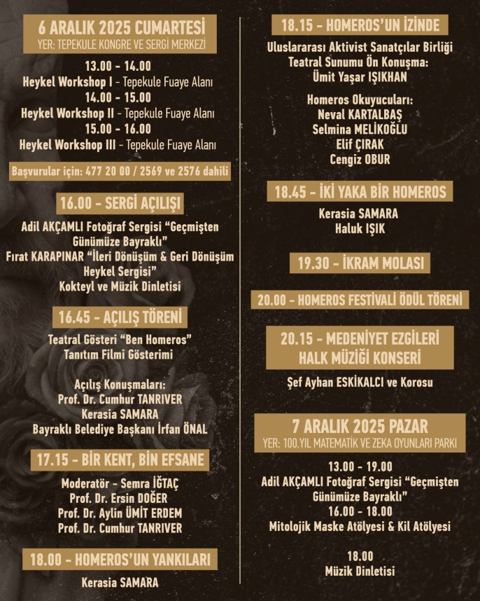 Festival süresince Bayraklı’nın farklı noktalarında; yazar buluşmaları, Homeros okumaları, Smyrna Antik Kenti üzerine sunumlar, akademik paneller ve söyleşiler gerçekleştirilecek. Çocuklar için özel olarak hazırlanan yaratıcı atölyeler, tiyatro ve dans gösterileri, müzik dinletileri ve konserler festival atmosferini zenginleştirecek. Açık hava etkinlikleriyle de kentin sokaklarına kültürel bir hareketlilik yayılacak, Bayraklı’nın tarihsel hafızası sanatın evrensel diliyle yeniden canlanacak.